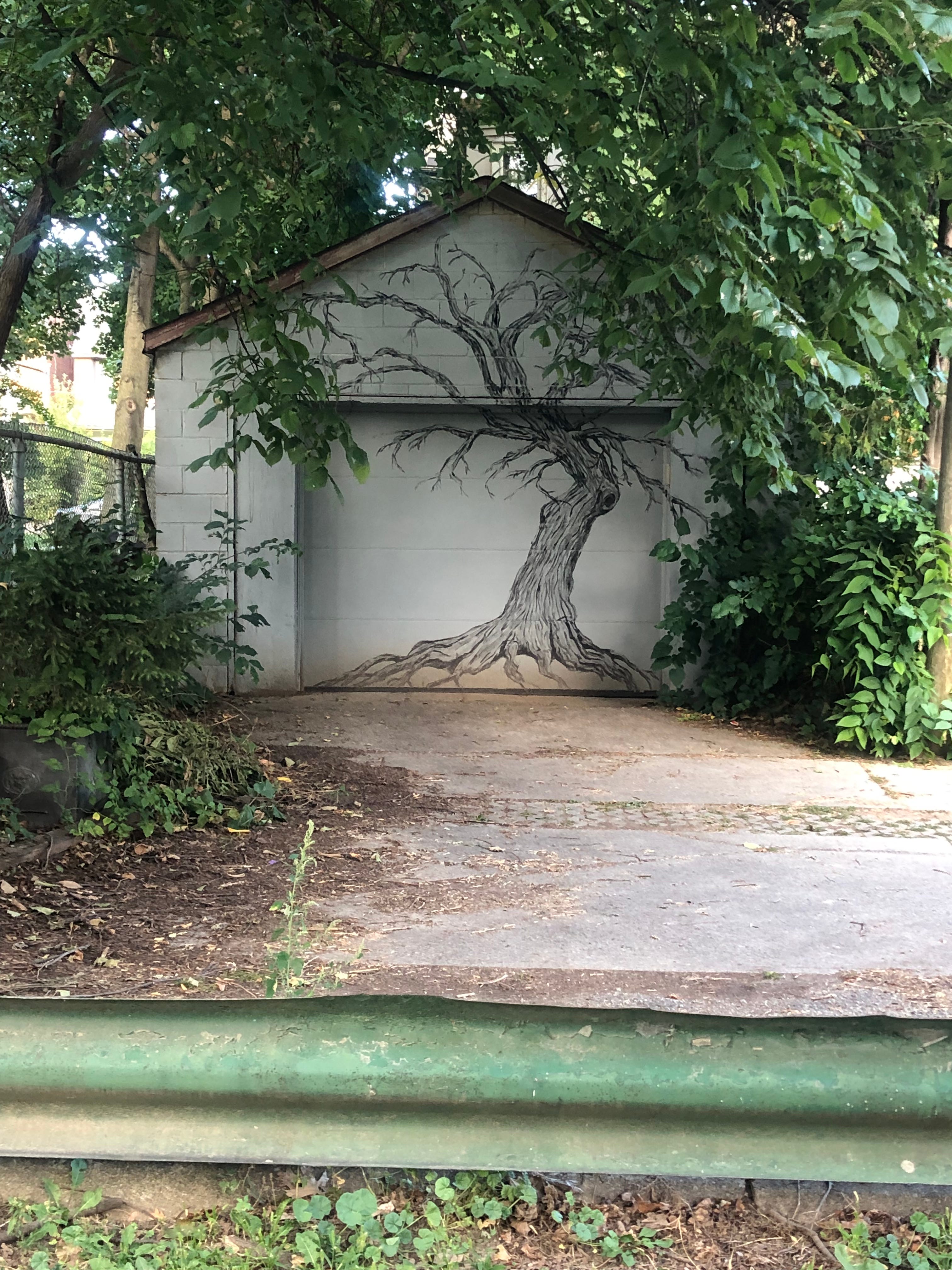 I walk through the park where this bit of magic is located every single day, no exaggeration, and have been doing so for weeks. But I only spotted this Fangorn-like painting a few days ago (I swear there’s a face in there somewhere), because I decided to sit down in a spot where I usually keep going. Just a turn of the head and this ethereal image of an ancient, leafless tree, its branches transforming the narrow, mundane laneway it overlooks, came into view. (I’ve included the uneven pavement and unattractive barrier to show how even prosaic surroundings can be lifted by skilled and thoughtful art.)