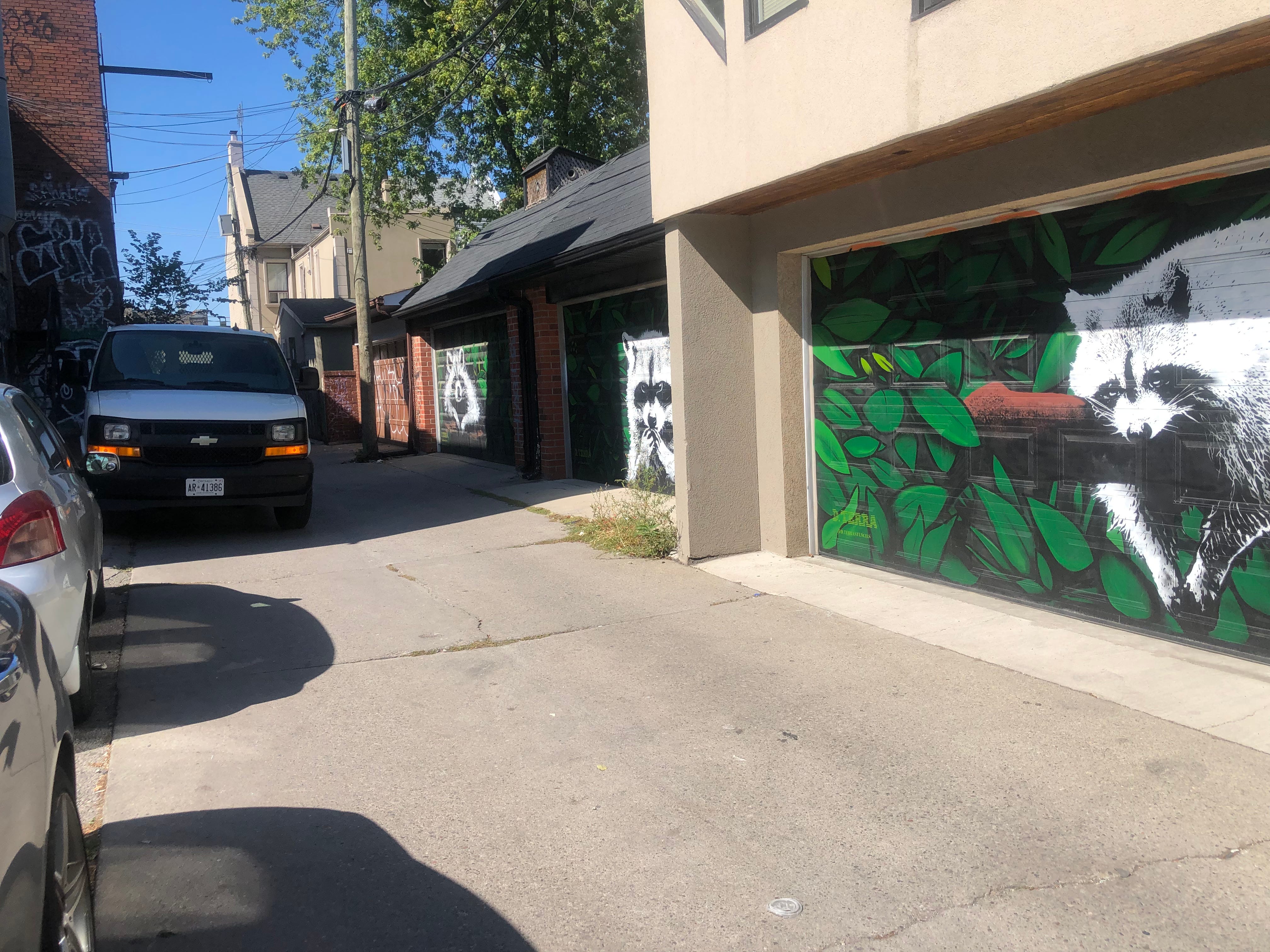 Auh, the humble ringed bandit. Other cities have foxes, possums, gulls. We have racoons. But what a wonderful way to celebrate their looks, cunning and incredible adaptability. This row of three racoon faces was first spotted by a friend as we walked past a rough and ready body shop. I had not noticed it before. At the end of the lines of cars up on hoists, one of these faces, painted on a laneway garage door behind the shop, fixed its stare on passers by along a busy main thoroughfare. I wanted to get the contrast between the cars and the confidently peering face but my camera didn’t seem to be capturing it. So I had to go and investigate. Thankfully. Asking a mechanic about it, he noted, “There are two more, around the corner.”